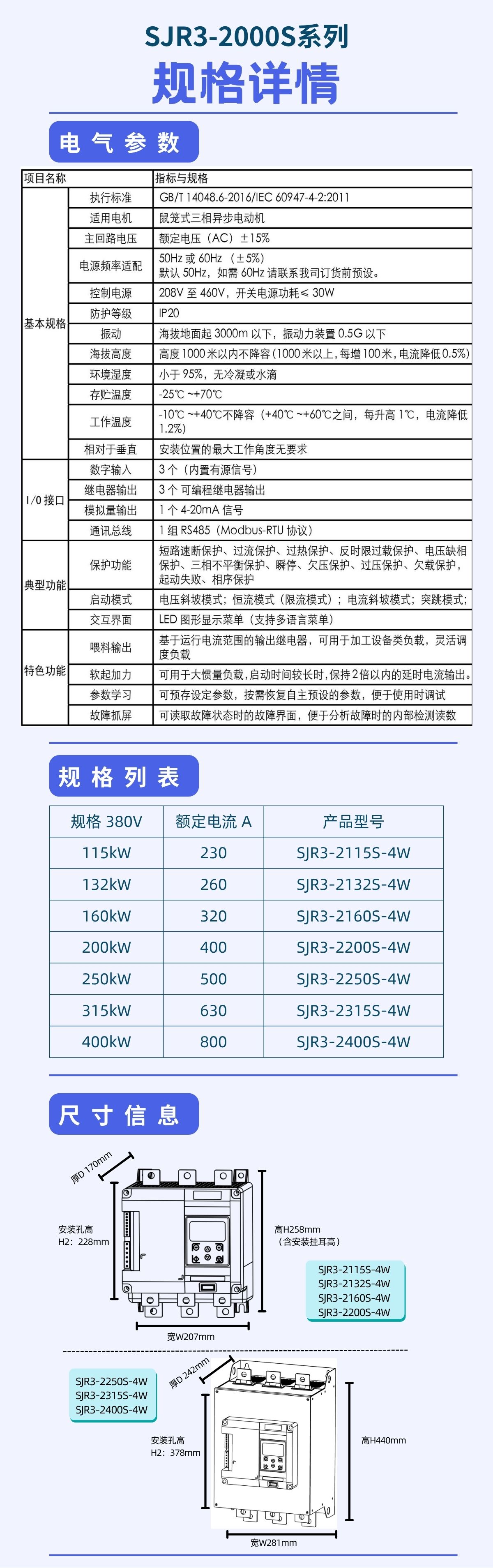 SJR3-2000S是金莎9001zz以诚为本公司最新研发的超紧凑软启动器,针对紧凑的车载(履带式)电柜 / 防爆电箱 / 壁挂基业箱 提出高密度电气解决方案,兼容在线式应用的同时兼备有外置旁路连接方式,增加了欠载,运行次数,运行时间,线性的温度监控等多种功能,内置集成了RS485通讯总线,提供多语种菜单。
